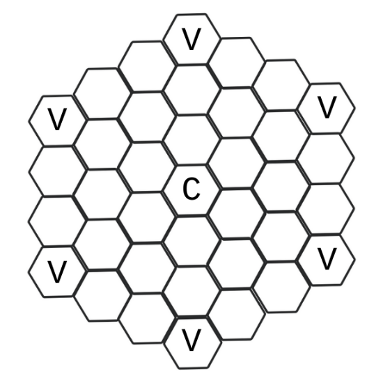 Figure 1 On the map, the Capital (C) tile is in the center and the six Village (V) tiles are in each corner.